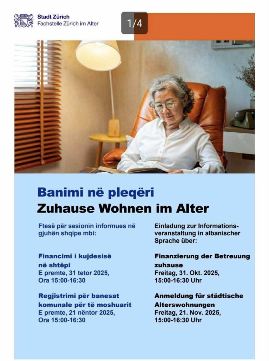 Ky aktivitet organizohet në bashkëpunim me Shërbimin “Fachstelle Zürich im Alter”, një degë e Ministrisë zvicerane të Shëndetësisë, dhe ka për qëllim informimin e qytetarëve mbi mbështetjet financiare të disponueshme për të moshuarit.