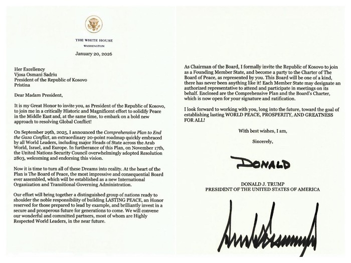 Osmani në një postim në Facebook ka publikuar letrën e presidentit Donald Trump lidhur me festën që Kosova të jetë në Bordin e Paqes, si anëtare themeluese, krah për krah me SHBA-të
